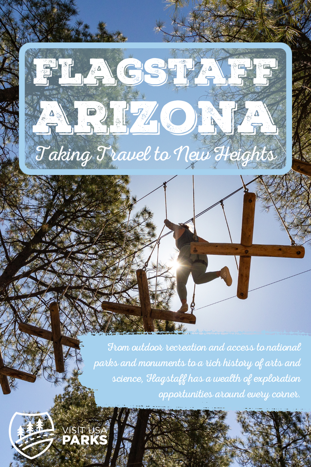 Flagstaff is a base camp for adventure with access to a wide variety of indoor and outdoor activities. Step out of your comfort zone and onto a rope bridge or zip line at Flagstaff Extreme. Located within the largest contiguous ponderosa pine forest in the world, this multi-level high ropes course will have you swinging, soaring, and climbing to new heights!