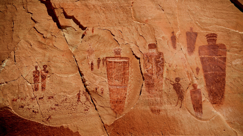 To experience some of the incredible rock art found in the park, we recommend visiting Horseshoe Canyon. This site contains some of the most significant rock art in North America. The Great Gallery includes well-preserved, life-sized figures with intricate designs. These sites are extremely fragile and deserve the care and respect of a sacred space. Please tread lightly and never touch any of the rock art or artifacts. If you are visiting Canyonlands in the fall, try to time your trip with the Red Canyon Powwow, taking place in Moab, UT, in October. At this festive event, Indigenous dancers, singers and drummers demonstrate their skills and share their heritage.