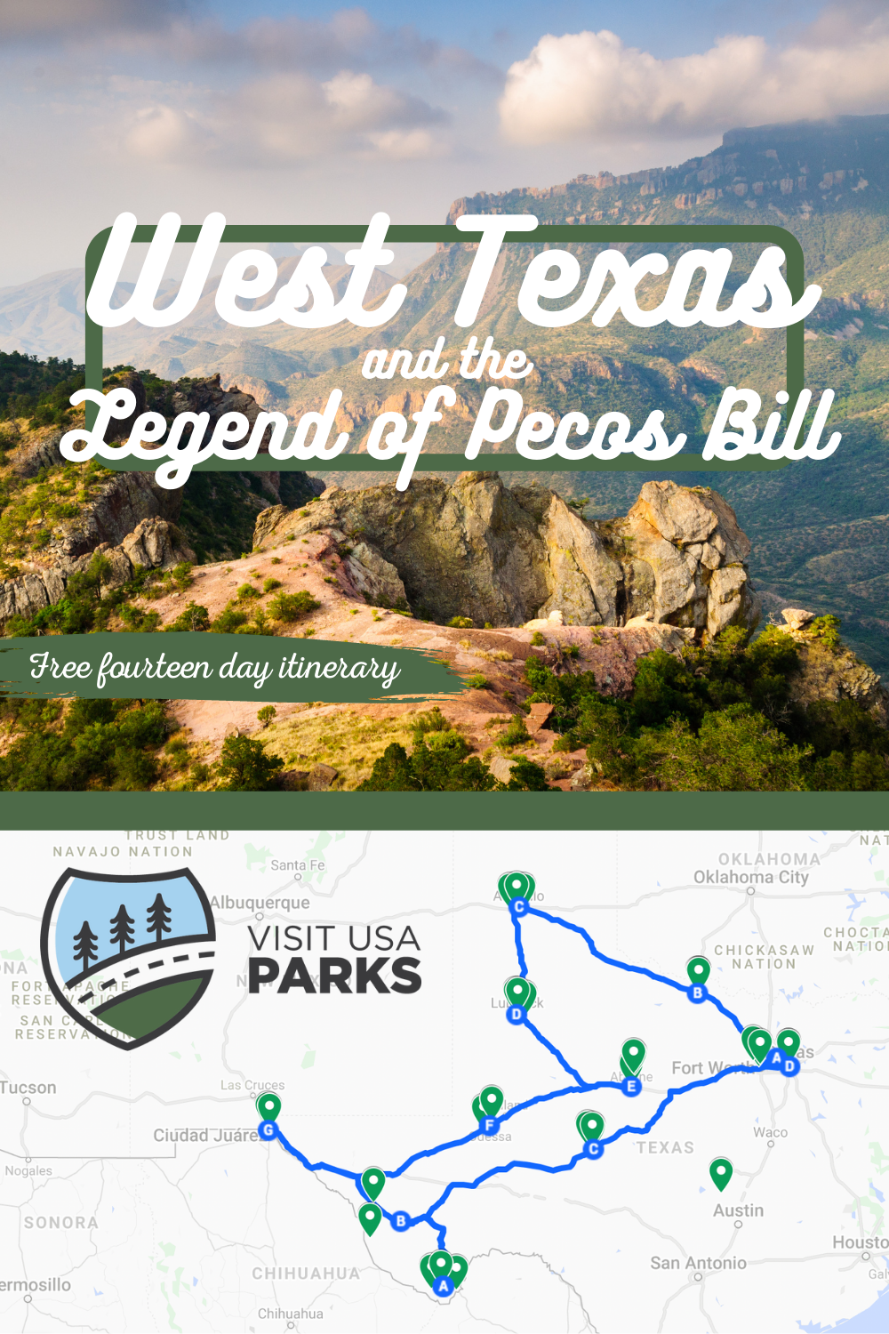 Pecos Bill, in American folklore, cowboy hero of the Pecos River region of Texas who was an exaggerated personification of Western stamina and values; his vivid exploits are analogous to those of the legendary giant lumberjack Paul Bunyan of the North Woods. The theme of Pecos Bill is to be ready for whatever life throws at you, and to never give up, and that idea embodies the spirit of West Texas. When you think of Texas, more times than not your thoughts are drawn to the dusty plains where vast open spaces are long between water holes and cowboys and bandits and quick-draw lawmen are sharing dusty saloons.  While that western spirit encapsulates Texas in American history, West Texas is also a place of modern cities, eclectic and dynamic communities and, of course, the birthplace of outlaw country.  This route is perfect for those who want to experience the culture and beauty of West Texas.
